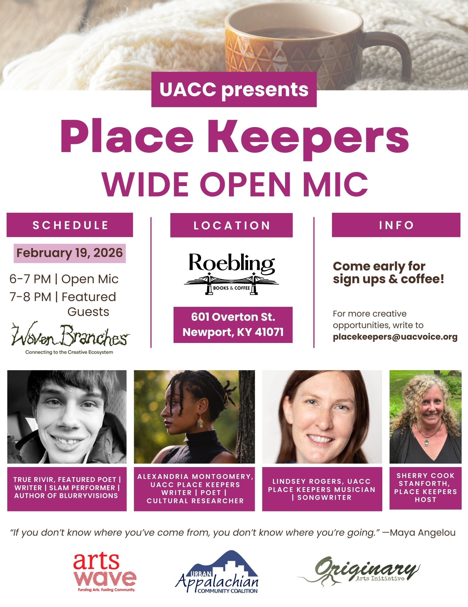 Feb 19, 2026 Place Keepers wide open mic at Roebling Books & Coffee in Newport, KY.